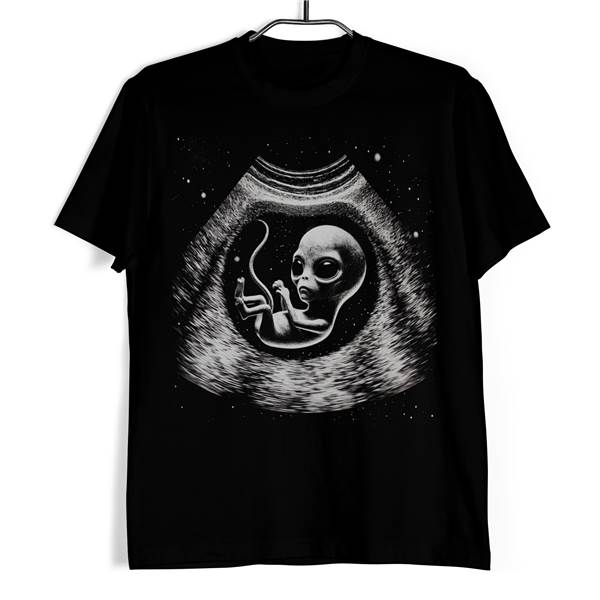 Tričko Alien Fetus je originální designový kousek, který kombinuje sci-fi tématiku s temnou estetikou. Na černém podkladu dominuje stylizovaný ultrazvukový obraz mimozemského embrya plujícího vesmírem, čímž tričko působí zároveň záhadně, futuristicky i lehce provokativně.