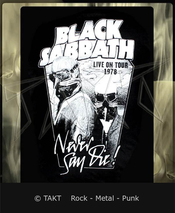 Licence - Import. Materiál: 100% bavlna, velmi dobrá kvalita. Rovný střih. Barva: černá. Potisk je na přední straně trička. Tričko BLACK SABBATH - Never Say Die je skvělým kouskem pro všechny fanoušky legendární kapely *Black Sabbath*. Tento design se inspiruje jejich posledním studiovým albem s Ozzym Osbournem, "Never Say Die!" (1978).