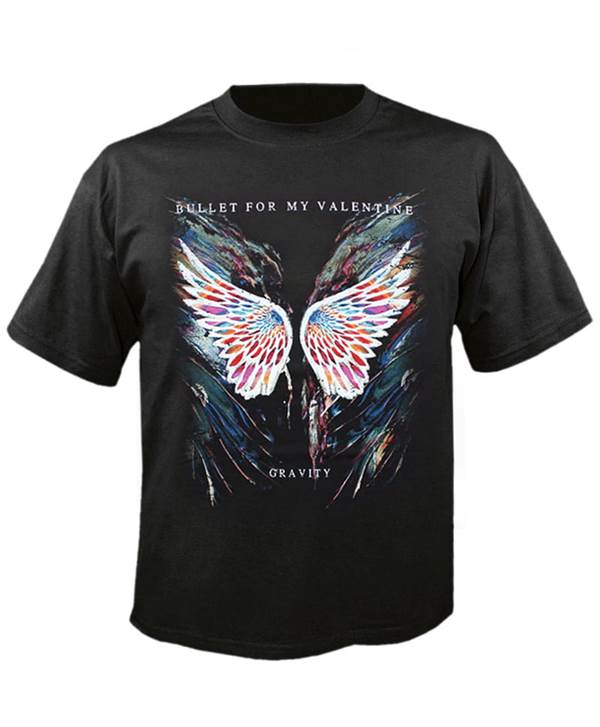 Stylové a vizuálně poutavé tričko Bullet For My Valentine – Gravity je oficiální merchandise inspirovaný stejnojmenným albem kapely z roku 2018. Přední straně dominuje barevně ztvárněný motiv křídel ve tvaru srdce na temném abstraktním pozadí, doplněný o název alba Gravity a logo kapely Bullet For My Valentine v elegantní typografii.