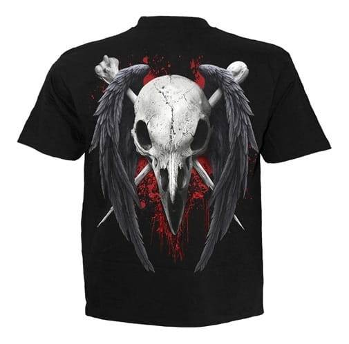 Tričko Death Raven je temný a působivý kus, který kombinuje gotickou symboliku se silným vizuálním vyjádřením. Na přední straně dominuje realisticky ztvárněná lebka s překříženými kostmi, skrz kterou jsou vražedně probodnuty dva hroty. Vrchol celého designu tvoří černý havran, jenž sedí na lebce jako strážce smrti. Zadní část trička pak doplňuje motiv ptačí lebky s roztaženými černými křídly – vizuál, který budí respekt a zvědavost zároveň.