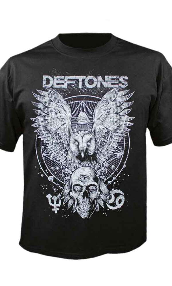 Licence " DEFTONES " Import. Materiál: kvalitní 100% bavlna. Rovný střih. Barva: černá. Technologie potisku: sítotisk. Potisk na přední a zadní stran