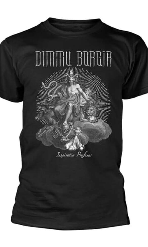 Tričko má velký potisk na přední i zadní straně. Na přední straně dominuje detailní grafika s mystickým motivem, zatímco zadní strana zobrazuje siluety dvou postav s nápisem "Inspiratio Profanus". Tento design dokonale zachycuje temnou a atmosférickou estetiku Dimmu Borgir, kteří jsou známí svými epickými a symfonickými skladbami.