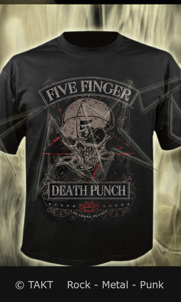 Licence - Import. Materiál: 100% bavlna. Rovný střih. Barva: černá. Potisk na přední straně trička. Příklad rozměru vzorku velikost M: délka - cca 76 cm, šířka - cca 49 cm. Fanouškovi by nemělo chybět tričko Five Finger Death Punch v šatníku.