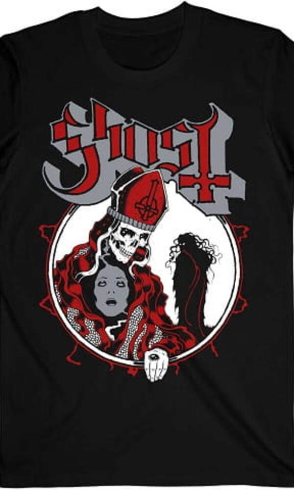 Tričko Ghost - Hi Red Possession je stylový kousek, který musí mít každý fanoušek kapely "Ghost" ve své sbírce. Tričko Ghost zaujme výrazným červeným a šedým potiskem na černém podkladu, kde je vyobrazen ikonický motiv Papa Emerituse, hlavní postavy této švédské heavy metalové skupiny Ghost. Design kombinuje temnou estetiku a nádech okultismu, což dokonale vystihuje vizuální identitu kapely.