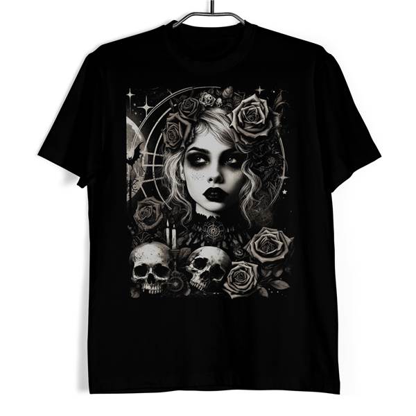 Tričko - Gotická růže Enigma přináší okouzlující spojení temné romantiky a záhadné elegance. Centrální motiv portrétního artworku s detailně zpracovanou podobou mladé dámy, obklopené nádhernými růžemi a tajemnými lebkami, je přímo fascinující. Její pohled, zároveň průzračný a zahalený tajemstvím, vás vtáhne do hloubky uměleckého díla, zatímco kolem ní symetricky rozmístěné lebky dotváří pocit gotické noblesy. Tento kousek je jako stvořený pro ty, kteří dávají přednost odvážným designům s hlubokým příběhem a pro milovníky umění, kteří chtějí svým oblečením vyjádřit svůj unikátní vkus.