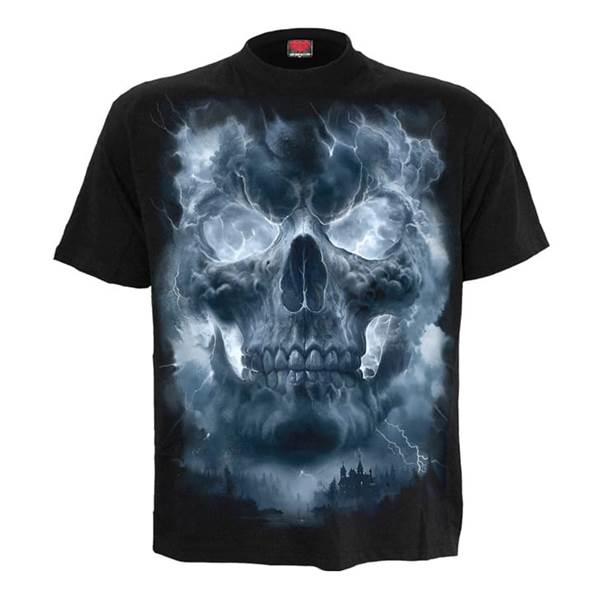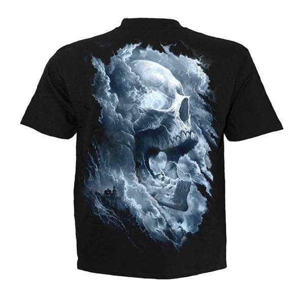 Tričko Grave Skies není jen motiv lebky v oblacích. Působí jako obraz noci, ve které se nebe probouzí k životu a nad tichou krajinou se stahuje něco temného a neodvratného. Mraky se v bouři skládají do tváře smrti, blesky trhají oblohu a pod nimi zůstává jen neklid, ticho a pocit, že se blíží něco, čemu nelze uniknout.