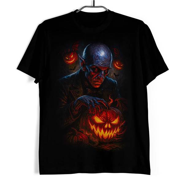 Motiv spojuje klasickou halloweenovou symboliku s temnější horror estetikou. Zlověstná postava, netopýři a svítící dýně vytvářejí výjev, který působí jako okamžik těsně předtím, než se noc promění v něco mnohem děsivějšího. Tričko Halloween Upír s dýní tak osloví každého, kdo má rád výrazné potisky s příběhem, temnou atmosférou a silným vizuálním dojmem.