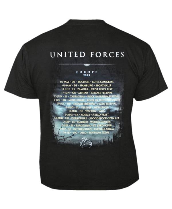 Tričko Helloween – United Forces přináší oficiální merch ke stejnojmennému evropskému turné z roku 2023, během něhož Helloween odehráli řadu nezapomenutelných koncertů napříč evropskými městy. Design spojuje temnou atmosféru s typickou dýní – symbolem kapely – a zadní strana přehledně zachycuje všechny zastávky turné.