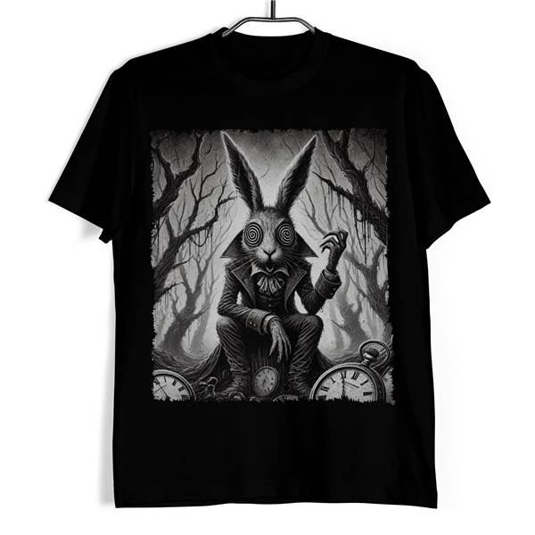 Originální a temně stylizované tričko Hypno Rabbit in Wonderland zaujme každého fanouška gothic, dark fantasy nebo alternativní módy. Design zobrazuje hypnotizujícího králíka v obleku s výraznýma spirálovýma očima, sedícího v temném lese mezi rozbitými kapesními hodinkami – jako z noční můry Alenky v Říši divů.