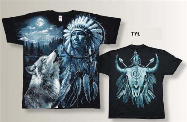 Tričko Indián – Spirit s výrazným designem zaujme každého milovníka přírodní symboliky, indiánské kultury a mystiky. Na přední straně trička dominuje velkoformátový motiv indiánského náčelníka s tradiční čelenkou, vlka vyjícího k úplňku a horské krajiny v pozadí. Zadní strana je ozdobena symbolickým vyobrazením bizoní lebky s peřím a duchovními prvky.