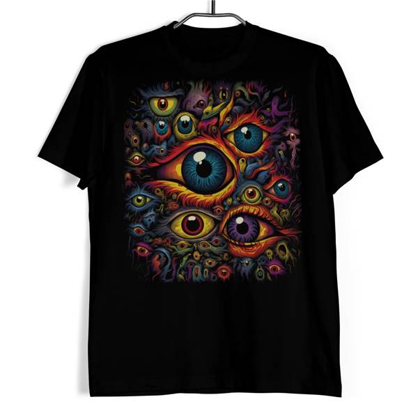 Kaleidoscope Vision tričku, kde není nic, co by se zdálo být. Obraz se skládá z fascinující mozaiky barevných očí, každé z nich s vlastním příběhem a nádechem tajemství. Na černém pozadí vynikne symfonie barev a tvarů, vytvářející vizuální spektrum, které vás vtáhne do kaleidoskopického snu. Nosíte-li toto tričko, budete nejen odění do mystiky, ale také do barevného zážitku, který nechá vaši duši tančit.