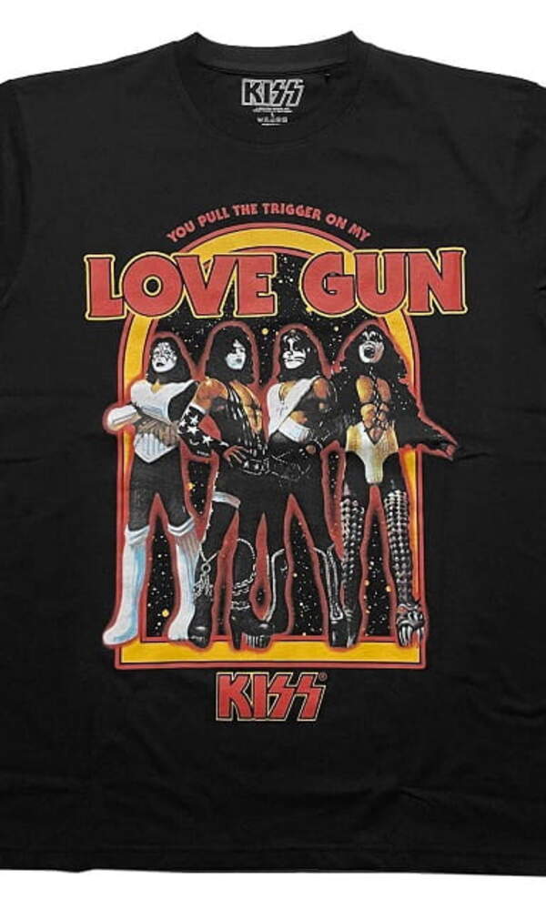 Tričko KISS - Love Gun Stars je ideálním doplňkem pro fanoušky legendární rockové kapely KISS. Tento design je inspirován ikonickým albem *Love Gun*, které vyšlo v roce 1977 a obsahuje některé z největších hitů kapely. Na přední straně trička je velký, barevný potisk členů KISS ve svých charakteristických kostýmech, což je věrný odraz stylu, který kapelu proslavil. Nad postavami je nápis "You pull the trigger on my Love Gun", odkazující na titulní skladbu z tohoto alba.