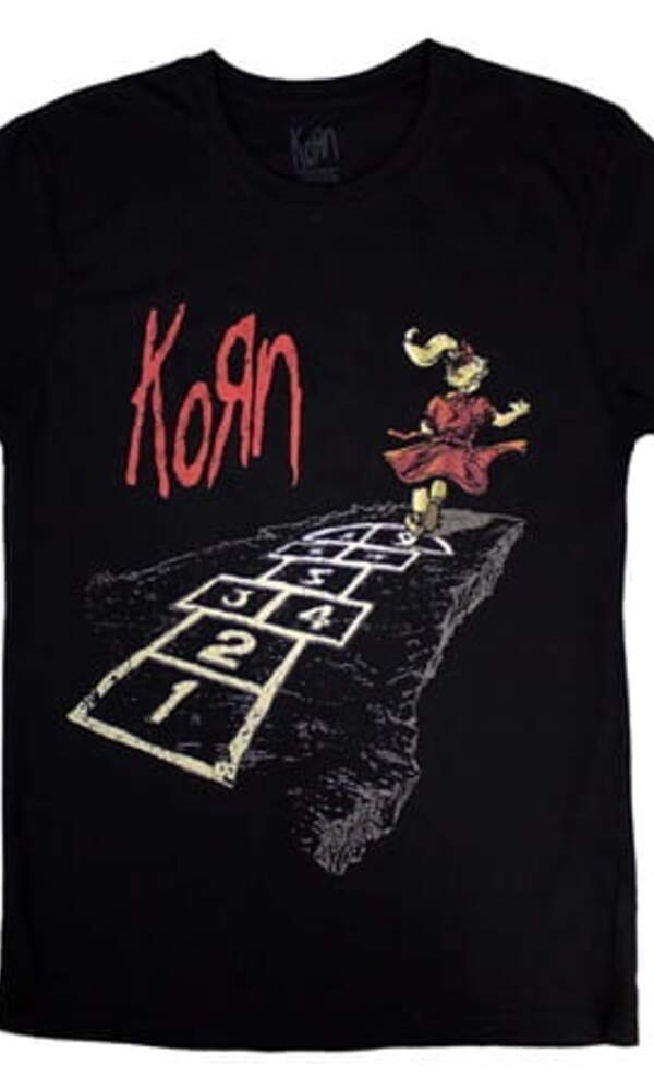 Na přední straně Trička Korn – Follow The Leader se nachází motiv dívky skákající panáka směrem k temnému okraji, což přesně kopíruje stylizovaný a provokativní obal zmíněného alba. Zadní stranu zdobí ručně psaný nápis „Follow the Leader“, který dodává tričku autentický a syrový vzhled. Tričko je vyrobeno ze 100% kvalitní bavlny a má pohodlný rovný střih, ideální pro každodenní nošení i koncertní atmosféru.