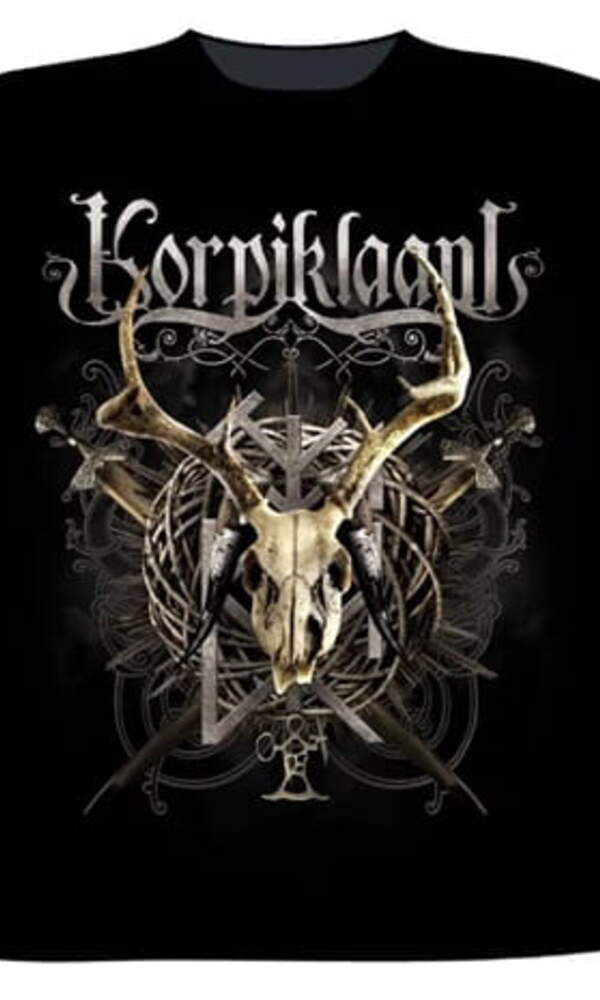 Autentické tričko Korpiklaani – Crest je jako stvořené pro milovníky folk metalu a severské atmosféry. Dominantní grafika na přední straně zobrazuje detailní lebku jelena s majestátními parohy, zasazenou do ornamentálního pozadí inspirovaného staroseverským motivem. Zadní strana trička je doplněna decentním stínovaným symbolem, který dokonale ladí s celkovou estetikou designu.