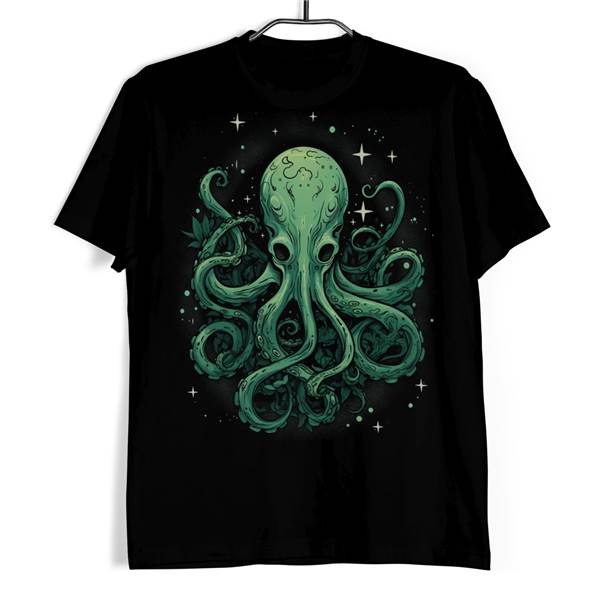 tričkem - Kosmický Kraken. Na tomto tričku je vyobrazena majestátní chobotnice, jejíž tančící chapadla se rozplétají ve vesmíru, což evokuje vznešenou sílu a nezkrotnost. Obarvení v odstínech tajemné zeleně a umístění mezi hvězdami a kosmickým prachem přidává dojem objevování starodávných mořských legend.