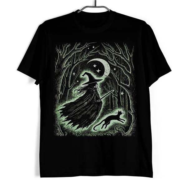 Tričko Let čarodějnice je temně stylový kousek, který okouzlí každého fanouška gotiky, fantasy nebo okultních motivů. Na přední straně tohoto černého trička je působivá ilustrace čarodějnice letící na koštěti, kterou doprovází černá kočka. Scéna se odehrává v tajemném lese pod hvězdami a půlměsícem, což dodává tričku mystickou atmosféru.