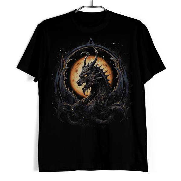 tričko - Měsíční drak a obklopte se aurou tajemství. Na tomto tričku se před obrovským oranžovým měsícem tyčí silueta temného draka, která dodává na dramatičnosti a připomíná staré legendy. Detaily, od ohnivých očí po ostré drápy, jsou vytvořeny tak, aby vynikly i ve tmě, čímž toto tričko stává perfektním společníkem pro každodenní dobrodružství.