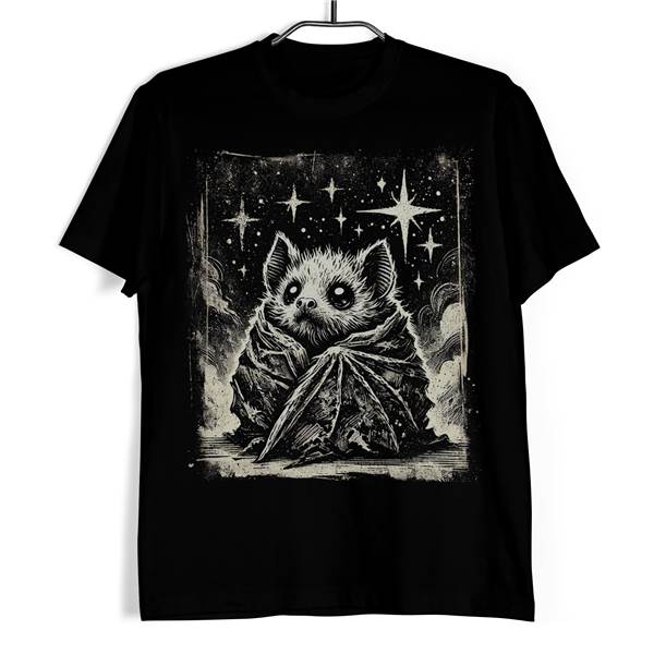 Tričko Netopýrek pod hvězdami spojuje temnou estetiku s jemnou dávkou roztomilosti, kterou ocení milovníci gotické, alternativní i fantasy módy. Hlavním motivem je detailně zpracovaný netopýr s velkýma očima, který se zachumlal do vlastních blanitých křídel pod noční oblohou posetou hvězdami. Celý motiv působí jako kouzelná pohádková ilustrace s nádechem temné poezie.