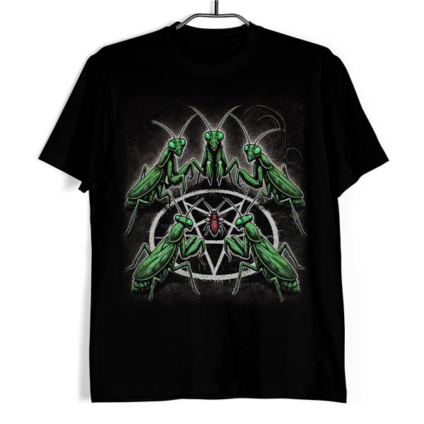 Tričko Pentagram Ritual je temně stylový kousek, který nadchne každého fanouška metalové, gothic nebo alternativní módy. Pět detailně vykreslených zelených kudlanek je umístěno do rituálního kruhu ve tvaru pentagramu, uprostřed s malým červeným broukem – to vše na černém pozadí, které zvyšuje kontrast a dramatičnost celého motivu.