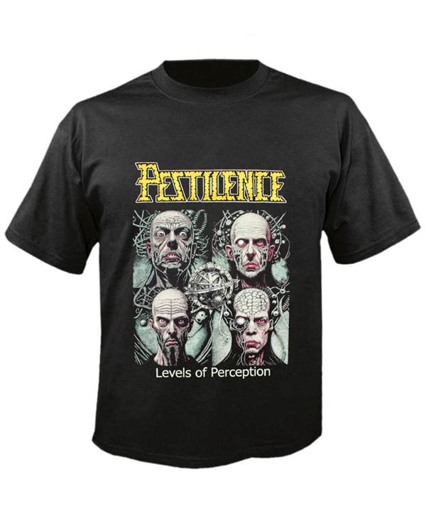 Tričko Pestilence – Levels of Perception je originálním kouskem pro fanoušky progresivního a technického death metalu. Na přední straně dominuje grafika se čtyřmi groteskními tvářemi a názvem Levels of Perception, která perfektně vystihuje temný a filozofický nádech tvorby této nizozemské kapely.