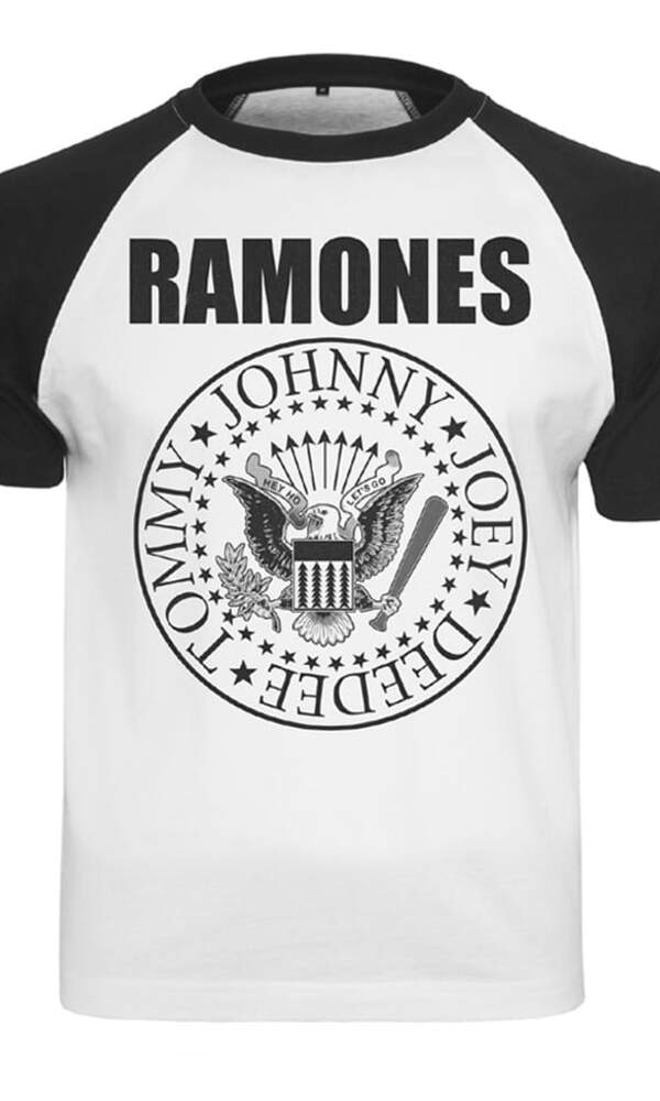 Licence RAMONES. Barva: bílá a černá. Materiál: kvalitní 100% bavlna. Technologie: sítotisk. Potisk na přední straně trička.