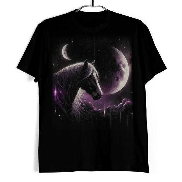 Vydejte se na magickou cestu s tričkem s koněm - Mystic Moon Horse, které přináší elegantní a mystický design. Černé tričko je ozdobeno působivou grafikou majestátního koně, jehož hříva se vlní ve větru, a pozadí tvoří tajemná krajina osvícená fialově zářícím měsícem. Tento motiv evokuje pocit klidu, tajemství a nespoutané svobody.
