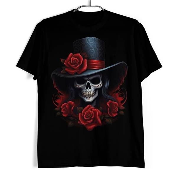 Zvolte odvahu a styl s naším "Tričkem s lebkou: Dáma s růžemi 2". Černé bavlněné tričko o gramáži 160 g/m2 zobrazuje unikátní design - usmívající se lebka dámy s šedými vlasy, kloboukem a červenými růžemi. Každý detail je zde vidět díky digiprint technologii. "Tričko s lebkou: Dáma s růžemi 2" - když vám obyčejná móda nestačí.