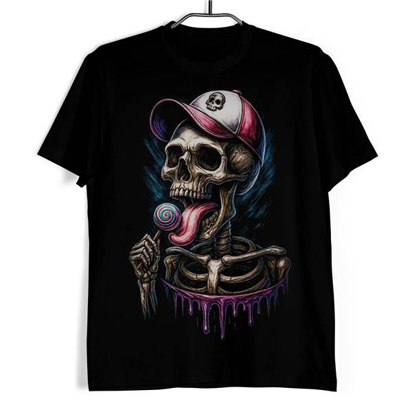 Samotný design staví na kontrastu mezi motivem smrti a odlehčeným, téměř rebelantským výrazem celé scény. Kostlivec s kšiltovkou a lízátkem nepůsobí jen jako další potisk, ale jako výrazná grafika s vlastním charakterem, která zaujme fanoušky lebek, alternativní módy i motivů s nadsázkou. Tričko s lebkou Kostlivec s lízátkem tak přináší styl, který je temný i hravý zároveň.