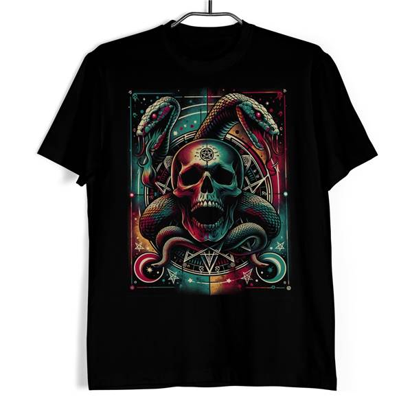 Nasaďte si tričko s lebkou - Nebeský had a okamžitě se stanete středem pozornosti. Tento design je skvělým ztělesněním mystické elegance a kultovní grafiky. Detailní lebka, ze které vycházejí hypnotizující hadi, vytváří ohromující vizuální efekt, jenž je zároveň doplněn o fascinující geometrické vzory a astrologické symboly. Toto tričko je zářným příkladem moderního umění, kde se potkává gotická estetika s novodobým digitálním designem.