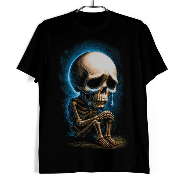 Hlavní motiv spojuje lebku, kostru, slzy a temně modré světlo do působivého vizuálu, který vyvolává melancholickou a výrazně alternativní atmosféru. Tričko s lebkou - Plačící kostra se hodí pro zákazníky, kteří mají rádi motivy lebek, temnou estetiku, gothic styl a originální potisky s výrazným emocním nábojem.