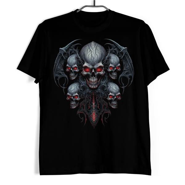 Tričko s lebkou - Totentanz představuje symfonii smrti a záhrobí s hypnotizujícím souborem lebek, jež svými ohnivě rudýma očima sledují každý váš krok. Tato neodolatelná grafika, která se vynořuje z temnoty na černém pozadí, je dechberoucím připomenutím života a jeho křehkosti. Toto tričko, oživené neobvyklými, ale uměleckými ornamenty, je nejen módním prohlášením, ale i odvážným vyjádřením nejtemnějších koutů vaší duše.