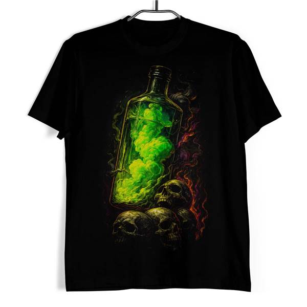 Motiv lahve s kouřovým obsahem a lebek pod ní působí jako výjev z temné laboratoře nebo noční můry, která se pomalu probouzí k životu. Právě tato kombinace horror estetiky, symboliky smrti a výrazných barev dělá z modelu Tričko s lebkou Zelený elixír smrti nepřehlédnutelný kousek pro fanoušky temných motivů a originálních potisků.