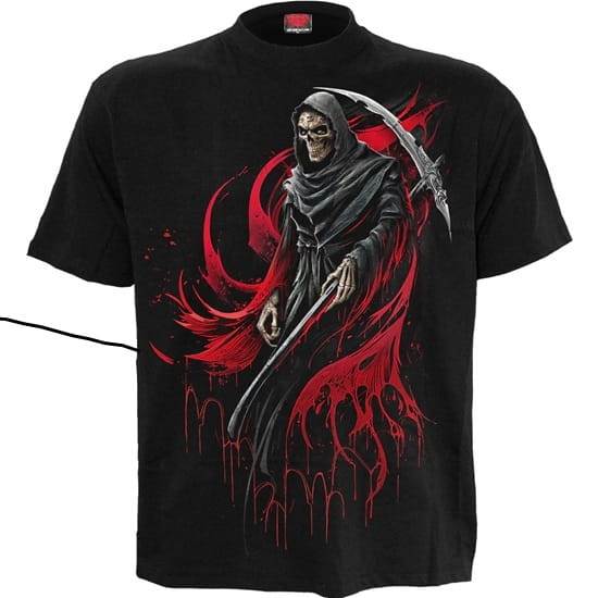 Unikátní a temné tričko s lebkou – Screaming Death z dílny renomované značky Spiral Direct přináší mistrovsky zpracovaný hororový motiv, který zaručeně upoutá pozornost. Přední straně dominuje postava Smrtky s krvavě rudým pláštěm a smrtící kosou, zatímco zadní stranu pokrývá děsivá lebka s otevřenou tlamou, tvořená z desítek dalších lebek a koster, jako by právě křičela ze záhrobí.