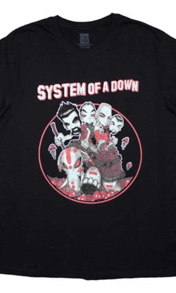 Představte svou vášeň pro alternativní metal s tričkem System of a Down - Mushroom People. Na přední straně trička dominuje unikátní kreslený motiv představující surrealistické „Mushroom People“, inspirované ikonickým stylem kapely "System of a Down". Výrazné červené a bílé barvy na černém podkladu dodávají tomuto tričku originální a drsný vzhled, který upoutá pozornost každého fanouška.
