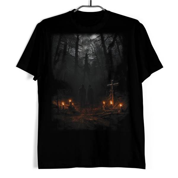 Tričko - temnota lesa v temném lese, zahaleném mlhou tajemství, se postávají dvě siluety. Uprostřed tohoto nádechu neznáma, louče a kříž ozařují tajemství, které je skryto v samotném srdci lesa. Toto tričko je vstupenkou do světa záhad a tajuplné temnoty, ideální pro ty, kteří se nebojí ponořit do hlubin nevysvětlitelného.