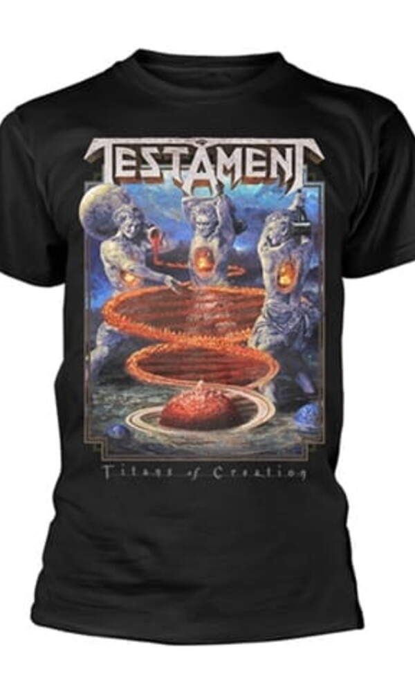 Objevte v sobě thrash metalovou legendu s tričkem Testament - Titans of Creation, inspirovaným stejnojmenným albem této ikonické kapely. Na přední straně najdete detailní artwork z obalu alba „Titans of Creation“, který zobrazuje epickou scénu mytologických titánů manipulujících s kosmickou energií. Zadní strana obsahuje logo *Testament* spolu s kruhovým designem zobrazujícím členy kapely v dynamickém uskupení.