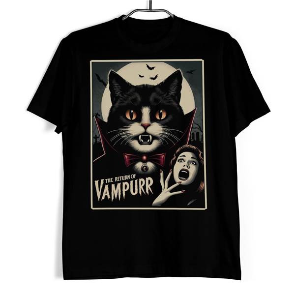 Přivítejte temnou noc s tričkem The Return of Vampurr, které zaručeně rozveselí každého milovníka hororů a koček. Tento unikátní design spojuje strašidelnou atmosféru klasických hororů s roztomilostí kočičího upíra. Na přední straně trička je velký potisk černé kočky s ostrými tesáky v upířím plášti, která budí hrůzu i úsměv zároveň. Pozadí doplňuje vyděšená postava a netopýři letící v záři měsíce, což dotváří dokonalý hororový styl.